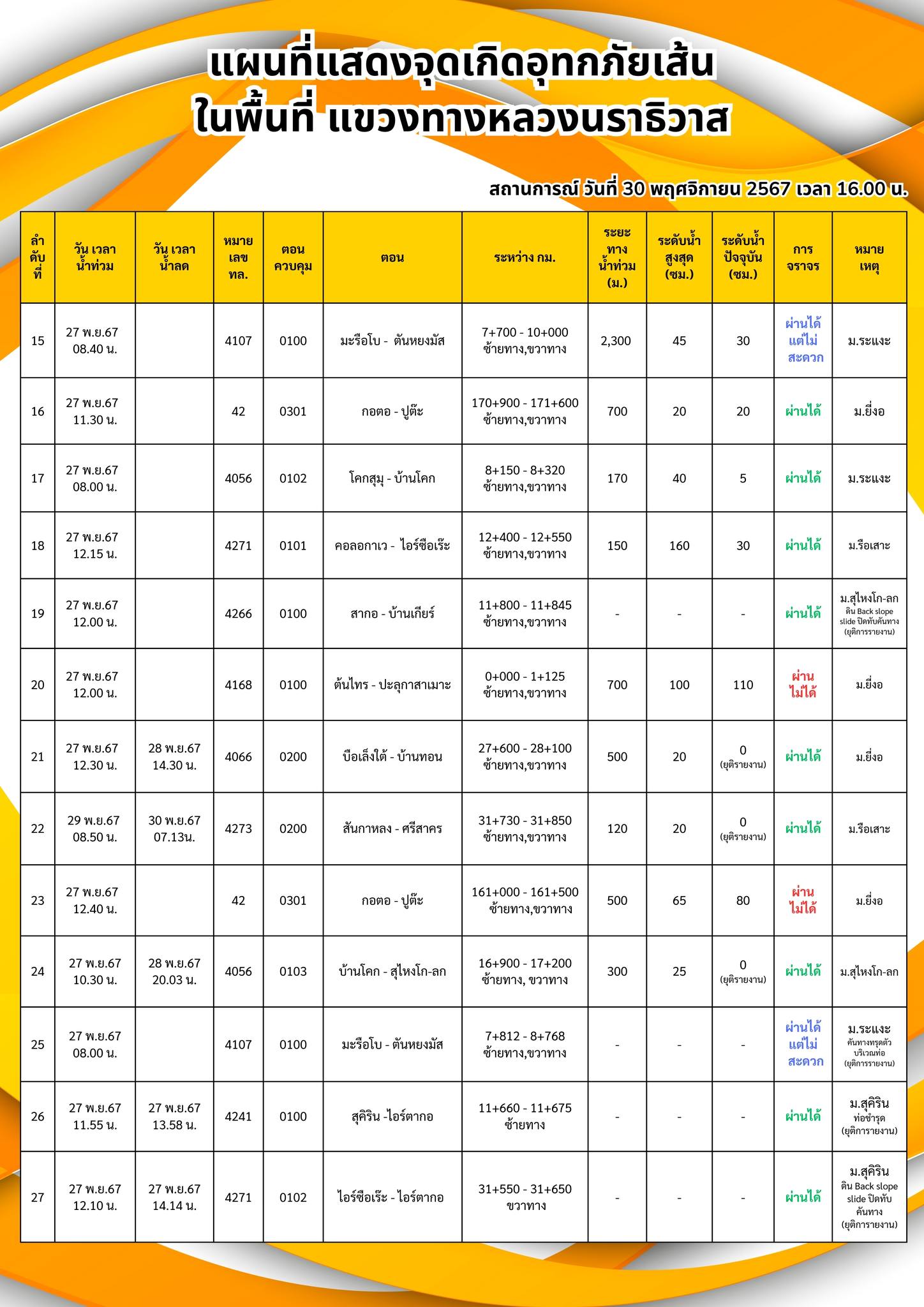 แขวงทางหลวงนราธิวาส ขอรายงานสถานการณ์อุทกภัยในพื้นที่จังหวัดนราธิวาส วันเวลาที่ update วันที่ 30 พ.ย. 67 เวลา 16.00 น.