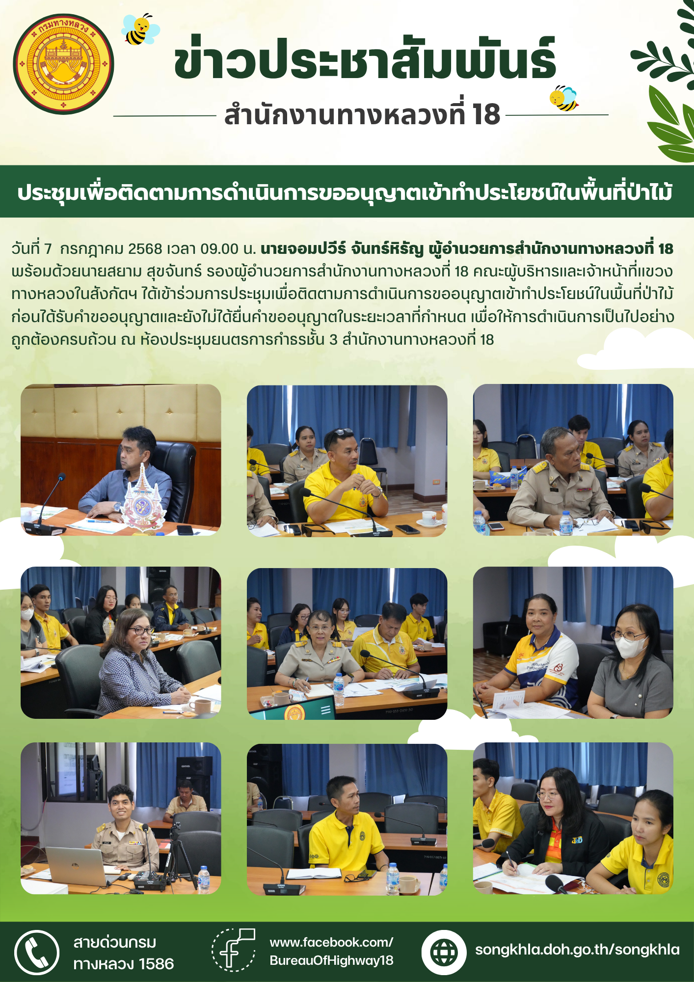 วันที่ 7 กรกฎาคม 2568 เวลา 09.00 น. นายจอมปวีร์ จันทร์หิรัญ ผู้อำนวยการสำนักงานทางหลวงที่ 18 พร้อมด้วยนายสยาม สุขจันทร์ รองผู้อำนวยการสำนักงานทางหลวงที่ 18 คณะผู้บริหารและเจ้าหน้าที่แขวงทางหลวงในสังกัดฯ ได้เข้าร่วมการประชุมเพื่อติดตามการดำเนินการขออนุญาตเข้าทำประโยชน์ในพื้นที่ป่าไม้ ก่อนได้รับคำขออนุญาตและยังไม่ได้ยื่นคำขออนุญาตในระยะเวลาที่กำหนด เพื่อให้การดำเนินการเป็นไปอย่างถูกต้องครบถ้วน ณ ห้องประชุมยนตรการกำธร ชั้น 3 สำนักงานทางหลวงที่ 18