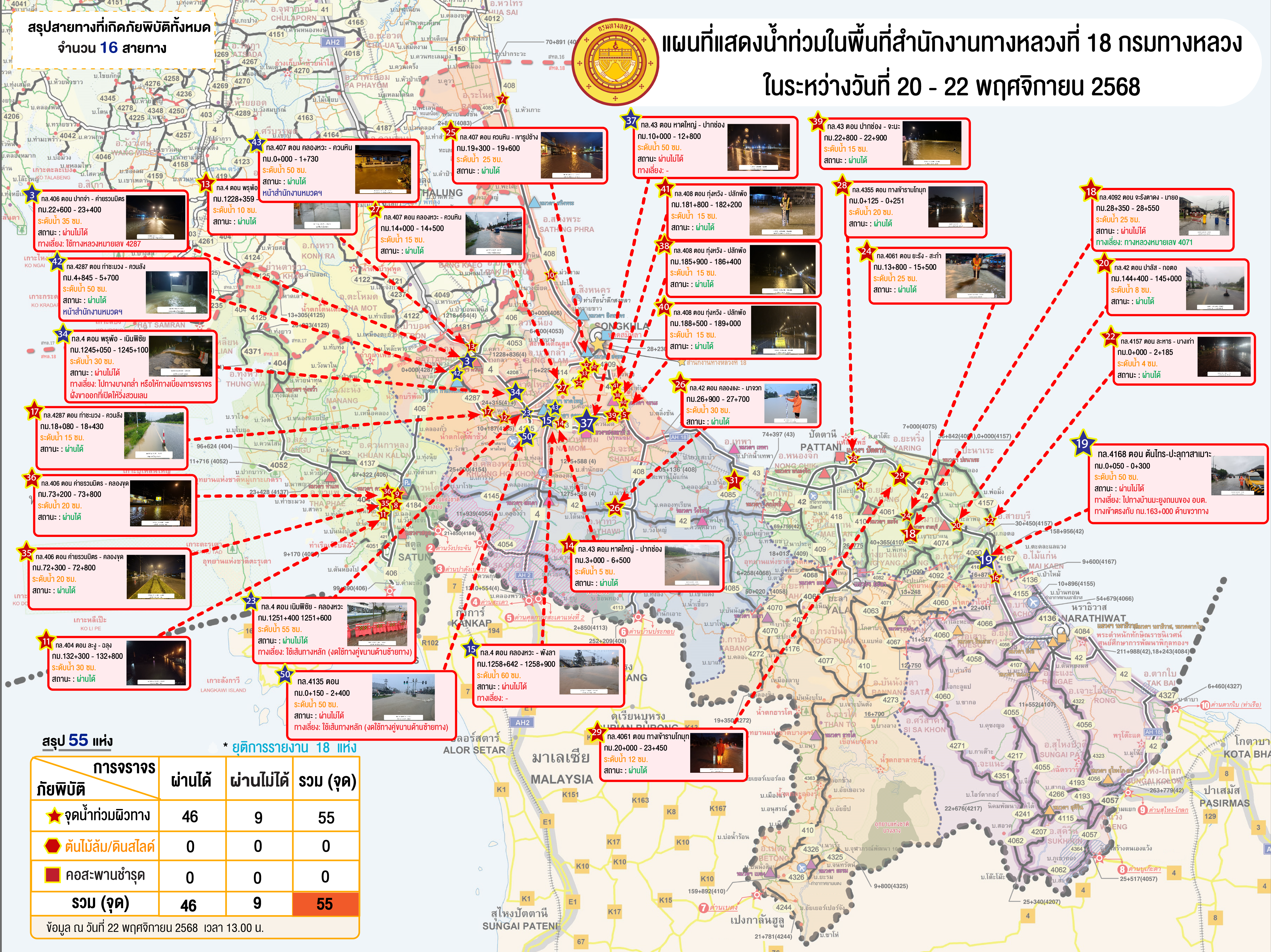 รายงานน้ำท่วมในระหว่างวันที่ 20-22 พ.ย. 68 ประจำวันที่ 22 พ.ย. 68 ณ เวลา 13.00 น.