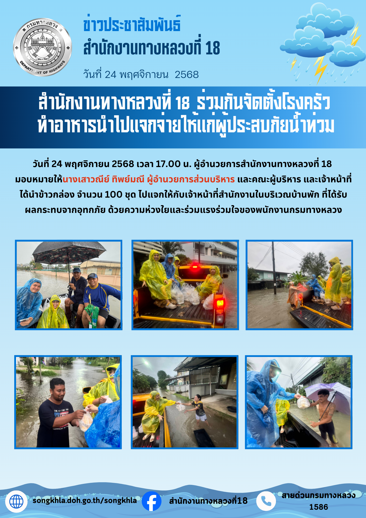 วันที่ 24 พฤศจิกายน 2568 เวลา 17.00 น. ผู้อำนวยการสำนักงานทางหลวงที่ 18 มอบหมายให้นางเสาวณีย์ ทิพย์มณี ผู้อำนวยการส่วนบริหาร และคณะผู้บริหาร และเจ้าหน้าที่ได้นำข้าวกล่อง จำนวน 100 ชุด ไปแจกให้กับเจ้าหน้าที่สำนักงานในบริเวณบ้านพัก ที่ได้รับผลกระทบจากอุทกภัย ด้วยความห่วงใยและร่วมแรงร่วมใจของพนักงานกรมทางหลวง