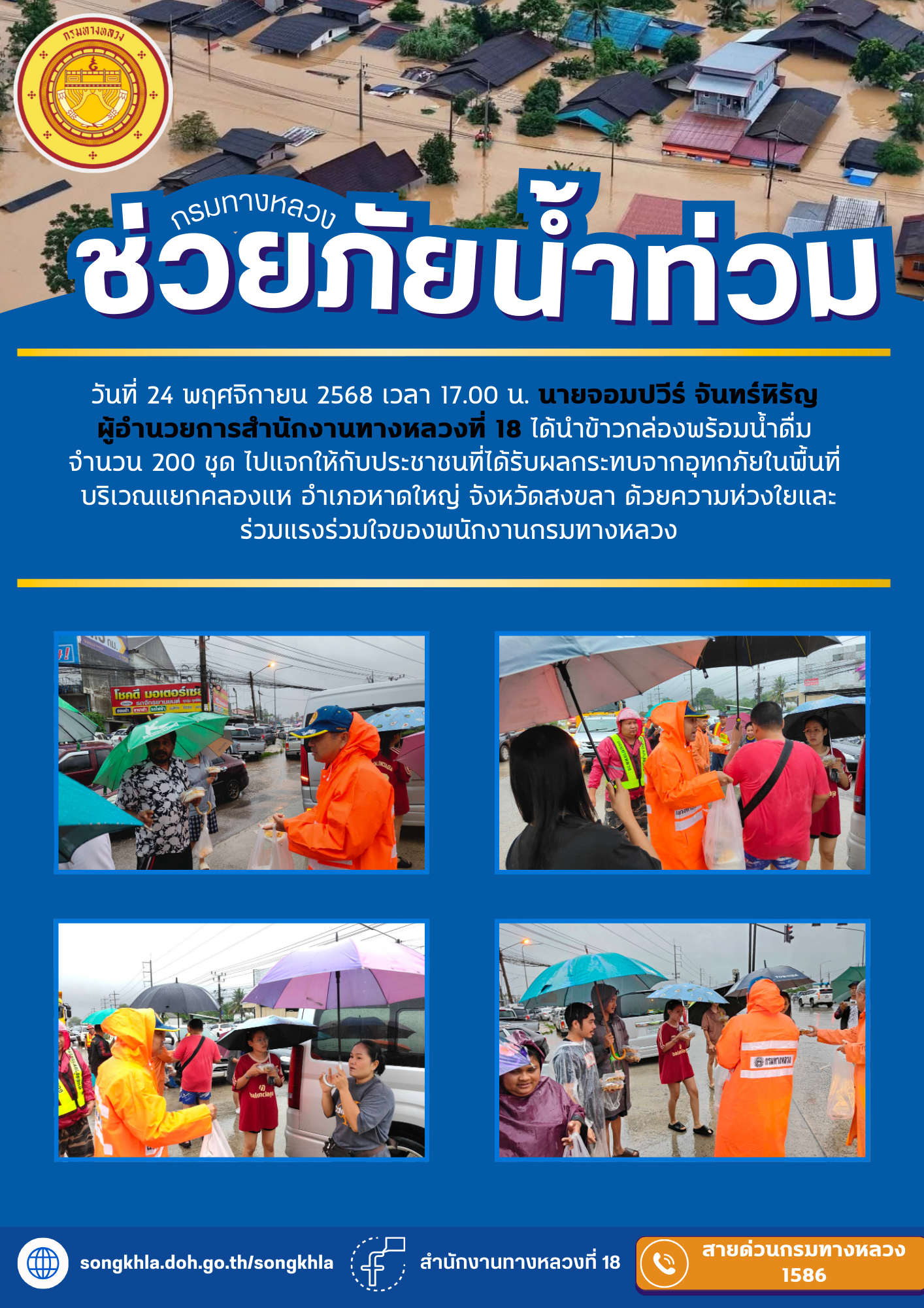 วันที่ 24 พฤศจิกายน 2568 เวลา 17.00 น. นายจอมปวีร์ จันทร์หิรัญ ผู้อำนวยการสำนักงานทางหลวงที่ 18 ได้นำข้าวกล่องพร้อมน้ำดื่ม จำนวน 200 ชุด ไปแจกให้กับประชาชนที่ได้รับผลกระทบจากอุทกภัยในพื้นที่บริเวณแยกคลองแห อำเภอหาดใหญ่ จังหวัดสงขลา ด้วยความห่วงใยและร่วมแรงร่วมใจของพนักงานกรมทางหลวง