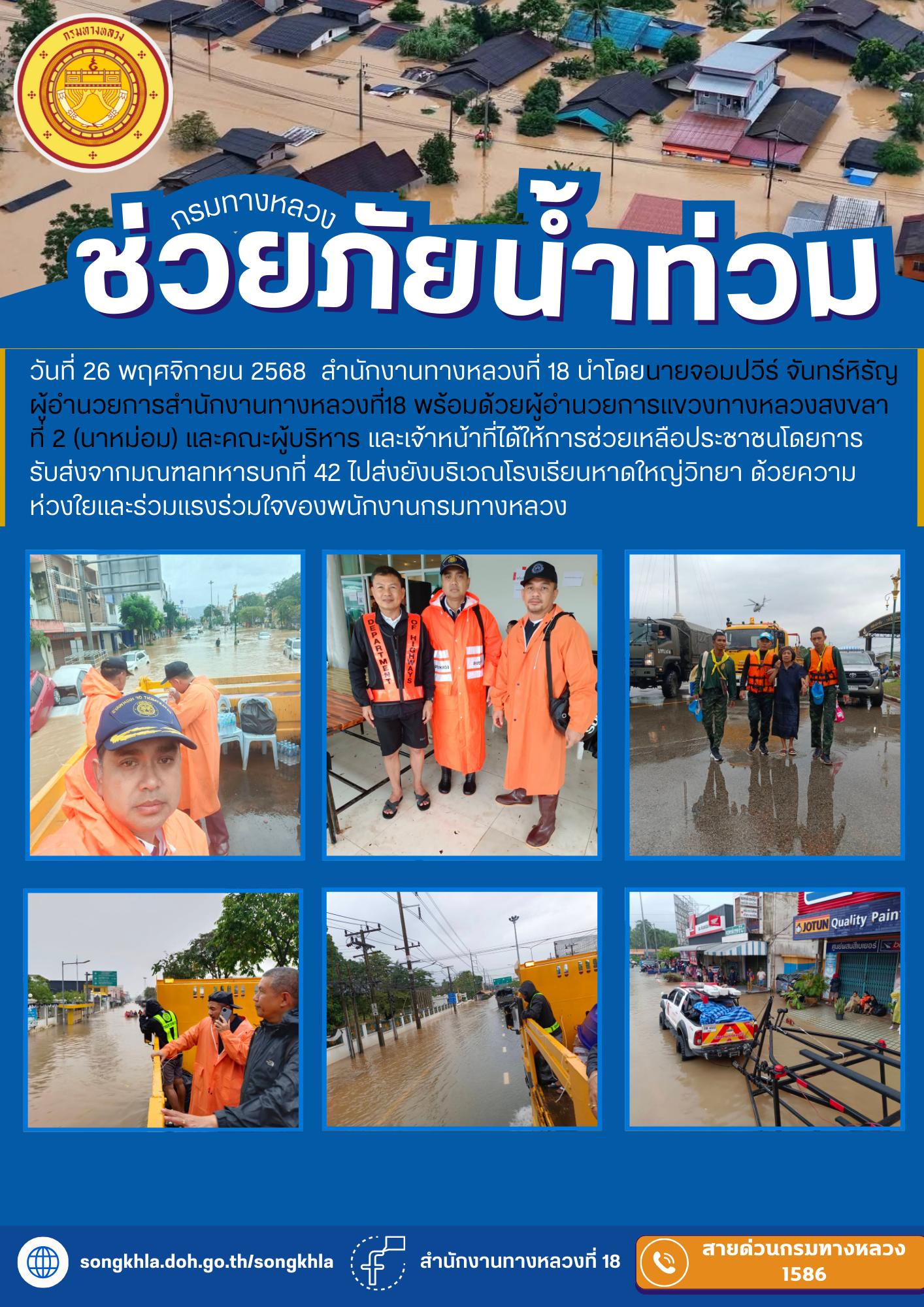 วันที่ 26 พฤศจิกายน 2568 สำนักงานทางหลวงที่ 18 นำโดยนายจอมปวีร์ จันทร์หิรัญ ผู้อำนวยการสำนักงานทางหลวงที่18 พร้อมด้วยผู้อำนวยการแขวงทางหลวงสงขลาที่ 2 (นาหม่อม) และคณะผู้บริหารผู้อำนวยการส่วนเครื่องกล และเจ้าหน้าที่ได้ให้การช่วยเหลือประชาชนโดยการรับส่งจากมณฑลทหารบกที่ 42 ไปส่งยังบริเวณโรงเรียนหาดใหญ่วิทยา ด้วยความห่วงใยและร่วมแรงร่วมใจของพนักงานกรมทางหลวง