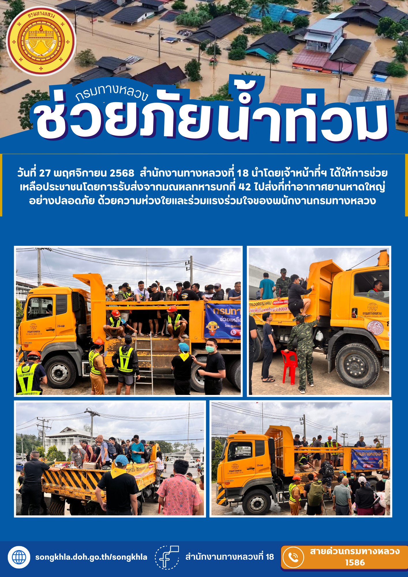 วันที่ 27 พฤศจิกายน 2568 สำนักงานทางหลวงที่ 18 นำโดยเจ้าหน้าที่ฯ ได้ให้การช่วยเหลือประชาชนโดยการรับส่งจากมณฑลทหารบกที่ 42 ไปส่งที่ท่าอากาศยานหาดใหญ่อย่างปลอดภัย ด้วยความห่วงใยและร่วมแรงร่วมใจของพนักงานกรมทางหลวง