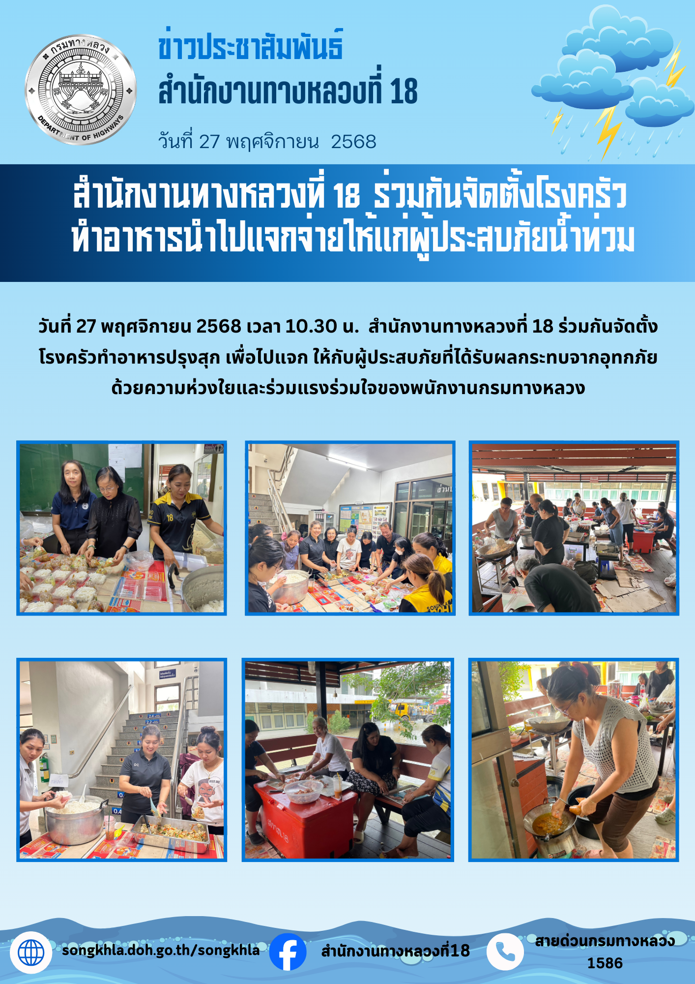 วันที่ 27 พฤศจิกายน 2568 เวลา 10.30 น. สำนักงานทางหลวงที่ 18 ร่วมกันจัดตั้งโรงครัวทำอาหารปรุงสุก เพื่อนำไปแจกให้กับผู้ประสบภัยที่ได้รับผลกระทบจากอุทกภัย ด้วยความห่วงใยและร่วมแรงร่วมใจของพนักงานกรมทางหลวง