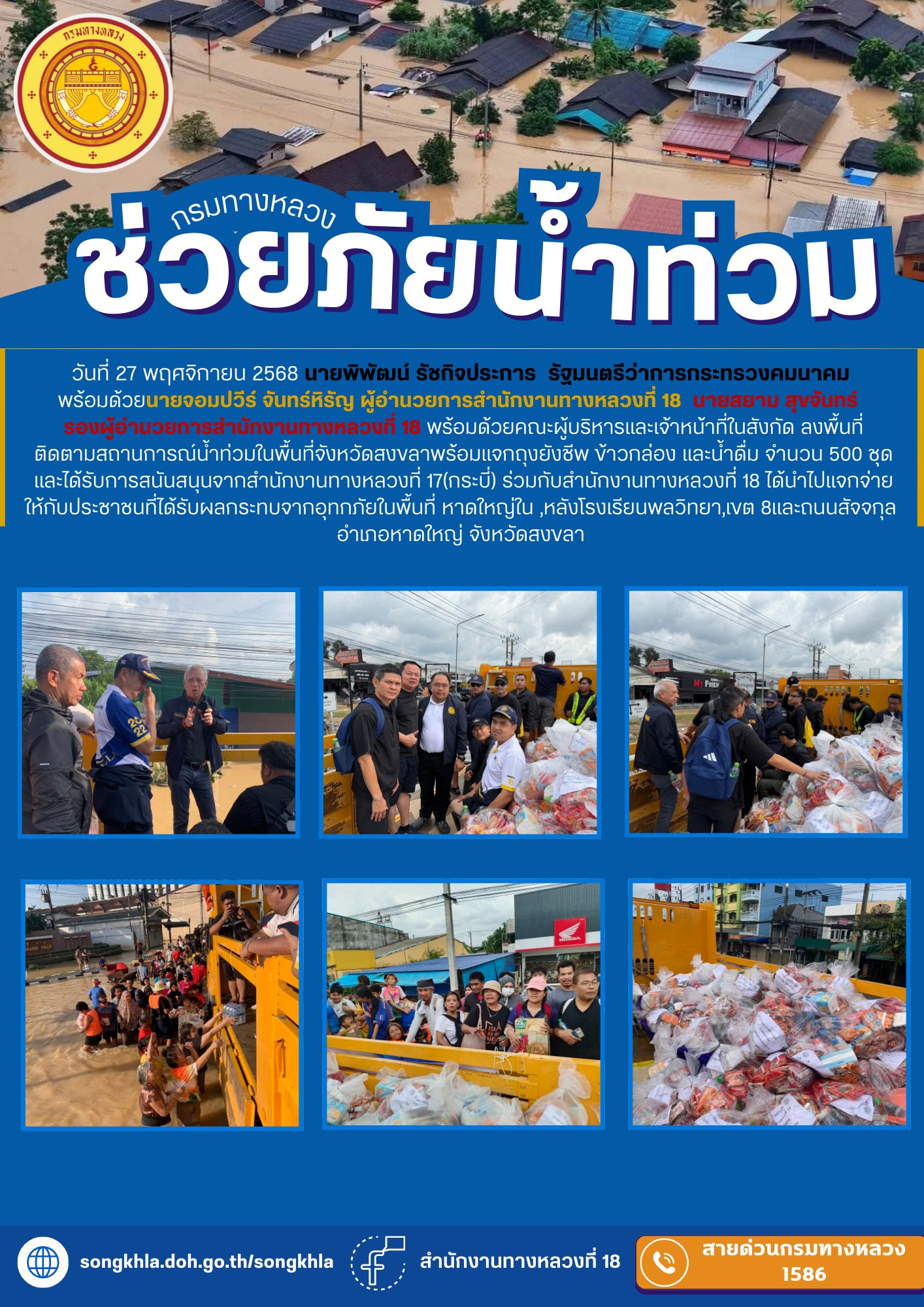 วันที่ 27 พฤศจิกายน 2568 นายพิพัฒน์ รัชกิจประการ รัฐมนตรีว่าการกระทรวงคมนาคม พร้อมด้วยคณะฯ โดยมีนายจอมปวีร์ จันทร์หิรัญ ผู้อำนวยการสำนักงานทางหลวงที่ 18 นายสยาม สุขจันทร์ รองผู้อำนวยการสำนักงานทางหลวงที่ 18 พร้อมด้วยคณะผู้บริหารและเจ้าหน้าที่ในสังกัด ลงพื้นที่ติดตามสถานการณ์น้ำท่วมในพื้นที่จังหวัดสงขลาพร้อมแจกถุงยังชีพ ข้าวกล่อง และน้ำดื่ม จำนวน 500 ชุด และได้รับการสนันสนุนจากสำนักงานทางหลวงที่ 17(กระบี่)ร่วมกับสำนักงานทางหลวงที่ 18 ได้นำไปแจกจ่ายให้กับประชาชนที่ได้รับผลกระทบจากอุทกภัยในพื้นที่ หาดใหญ่ใน ,หลังโรงเรียนพลวิทยา,เขต 8และถนนสัจจกุล อำเภอหาดใหญ่ จังหวัดสงขลา ด้วยความห่วงใยและร่วมแรงร่วมใจของพนักงานกรมทางหลวง