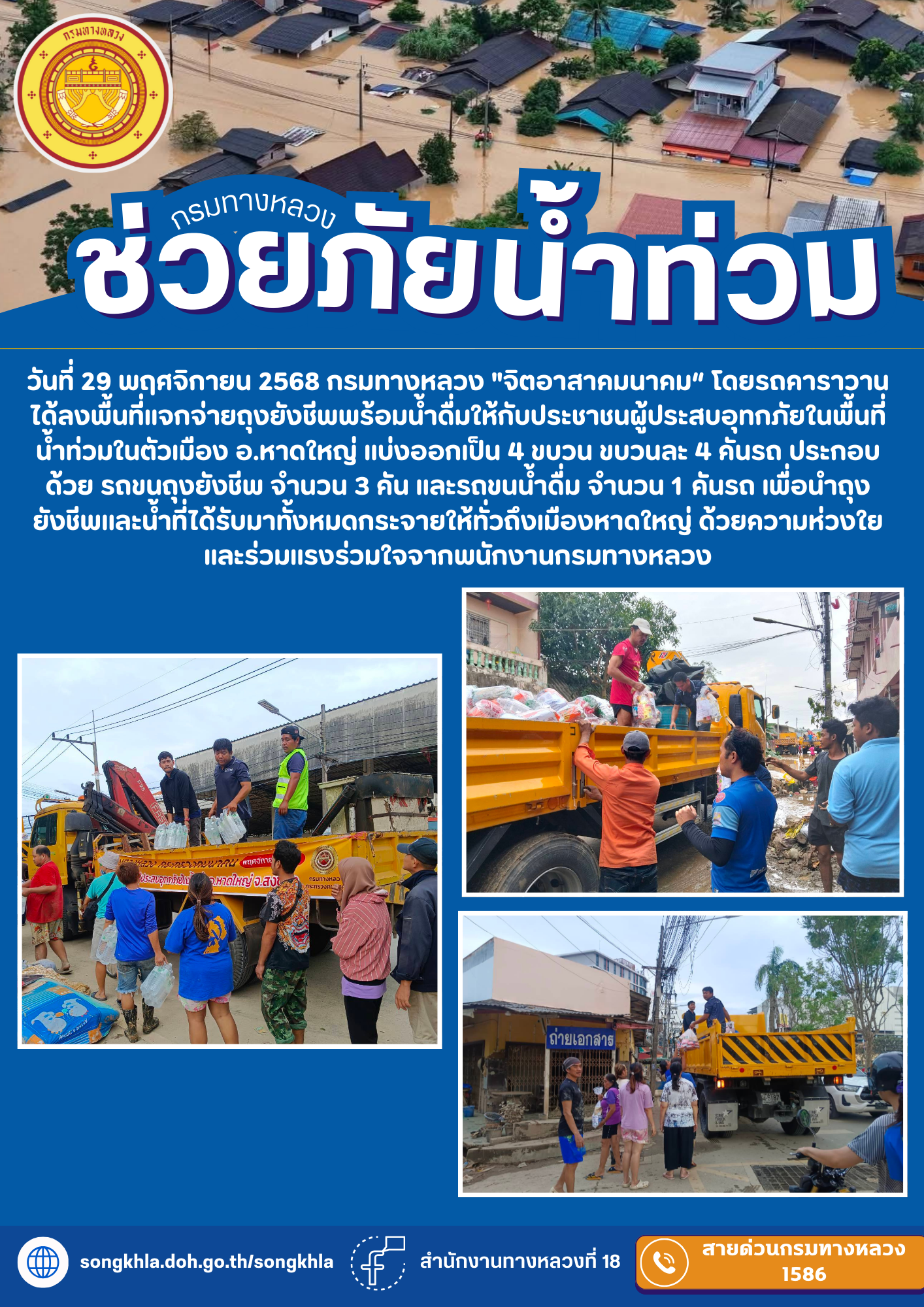 วันที่ 29 พฤศจิกายน 2568 กรมทางหลวง "จิตอาสาคมนาคม“ โดยรถคาราวาน ได้ลงพื้นที่แจกจ่ายถุงยังชีพพร้อมน้ำดื่มให้กับประชาชนผู้ประสบอุทกภัยในพื้นที่น้ำท่วมในตัวเมือง อ.หาดใหญ่ แบ่งออกเป็น 4 ขบวน ขบวนละ 4 คันรถ ประกอบด้วย รถขนถุงยังชีพ จำนวน 3 คัน และรถขนน้ำดื่ม จำนวน 1 คันรถ เพื่อนำถุงยังชีพและน้ำที่ได้รับมาทั้งหมดกระจายให้ทั่วถึงเมืองหาดใหญ่ ด้วยความห่วงใยและร่วมแรงร่วมใจจากพนักงานกรมทางหลวง