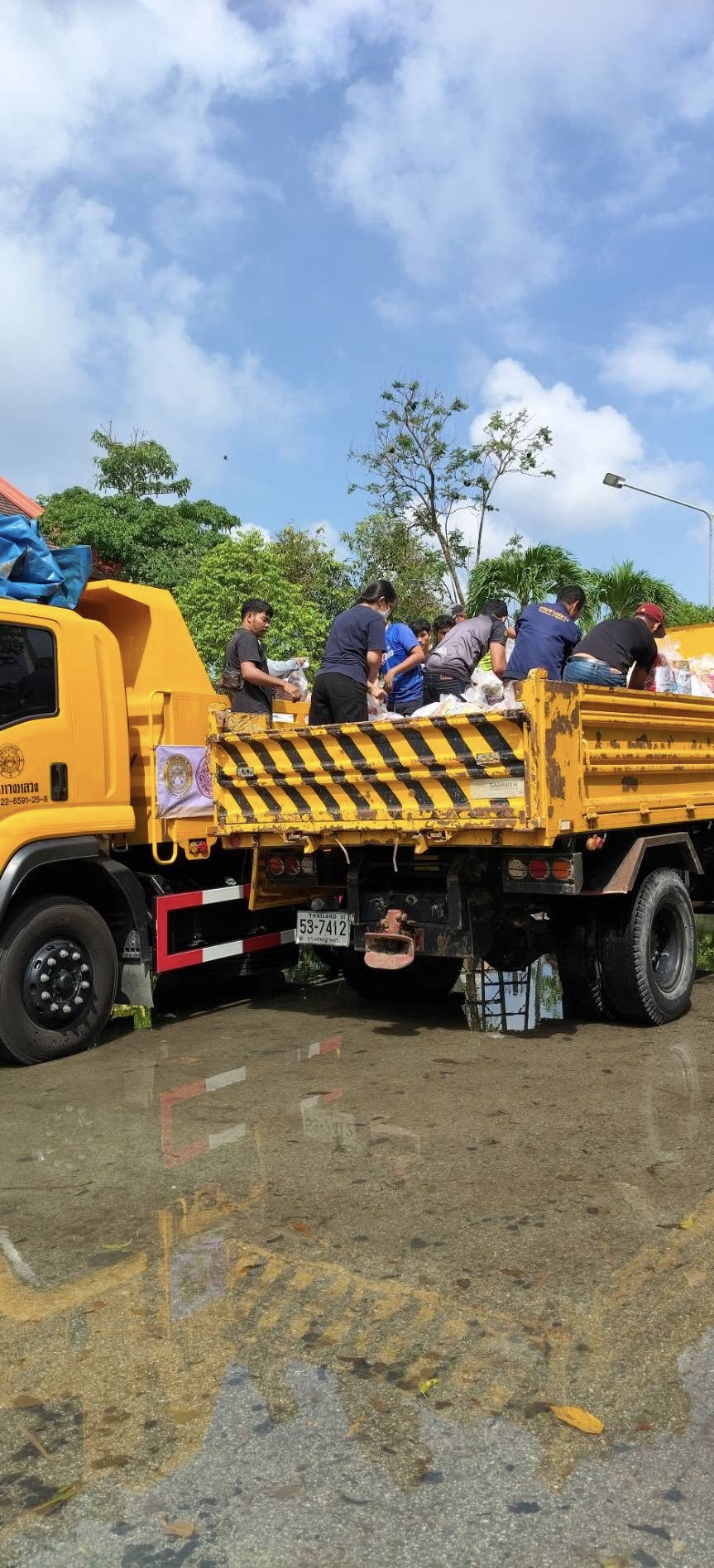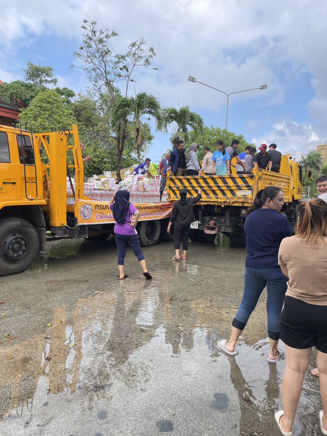 รถคาราวาน กรมทางหลวง โดยเจ้าหน้าที่ฯ ได้รับภารกิจส่งถุงยังชีพและน้ำดื่มอย่างละ 1 คันรถ ไปยังแขวงทางหลวงปัตตานี
