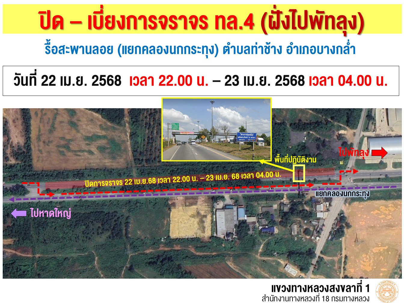 9 03/04/2568 แจ้งปิด-เบี่ยงช่องจราจร ทางหลวงหมายเลข 4 เพื่อรื้อสะพานลอย บริเวณแยกคลองนกกระทุง