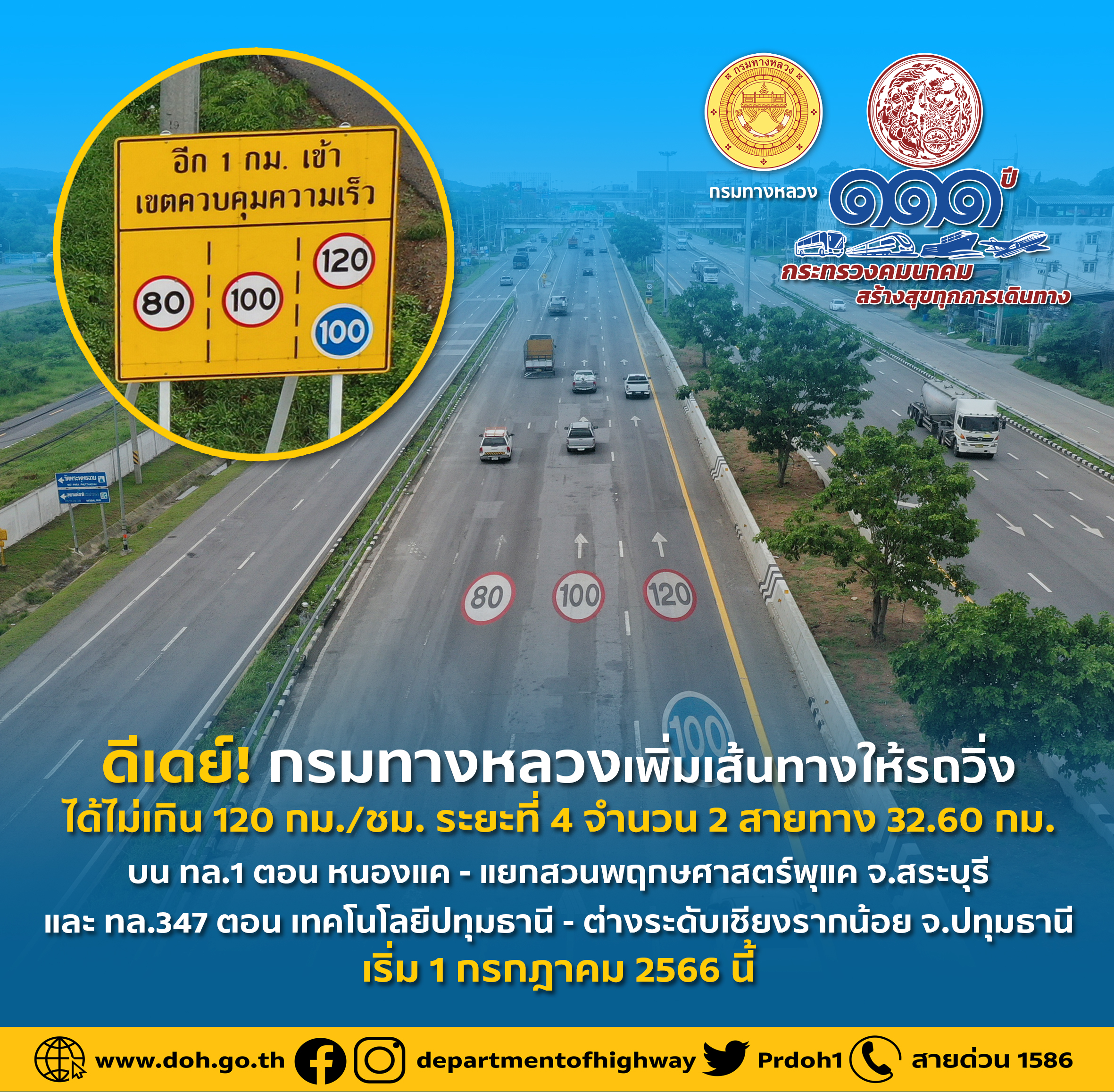 กรมทางหลวง เพิ่มเส้นทางให้ใช้ความเร็ว 120 กม./ชม. เพิ่มเติม จำนวน 2 เส้นทาง ระยะทางรวม 32.60 กม. เริ่ม 1 กรกฎาคม 2566 นี้