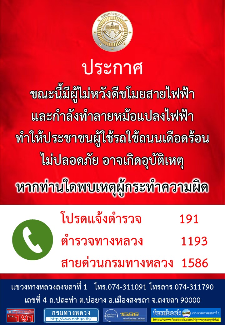 ช่วยกันเป็นหูเป็นตา พบเห็นการโจรกรรมอุปกรณ์ไฟฟ้าทางหลวง
