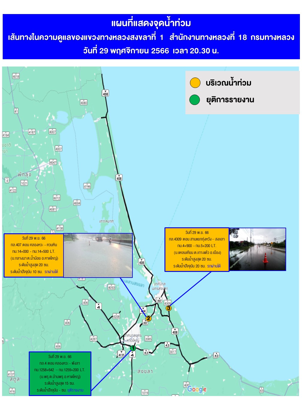 สถานการณ์น้ำท่วมในพื้นที่สายทางความรับผิดชอบของแขวงทางหลวงสงขลาที่ 1