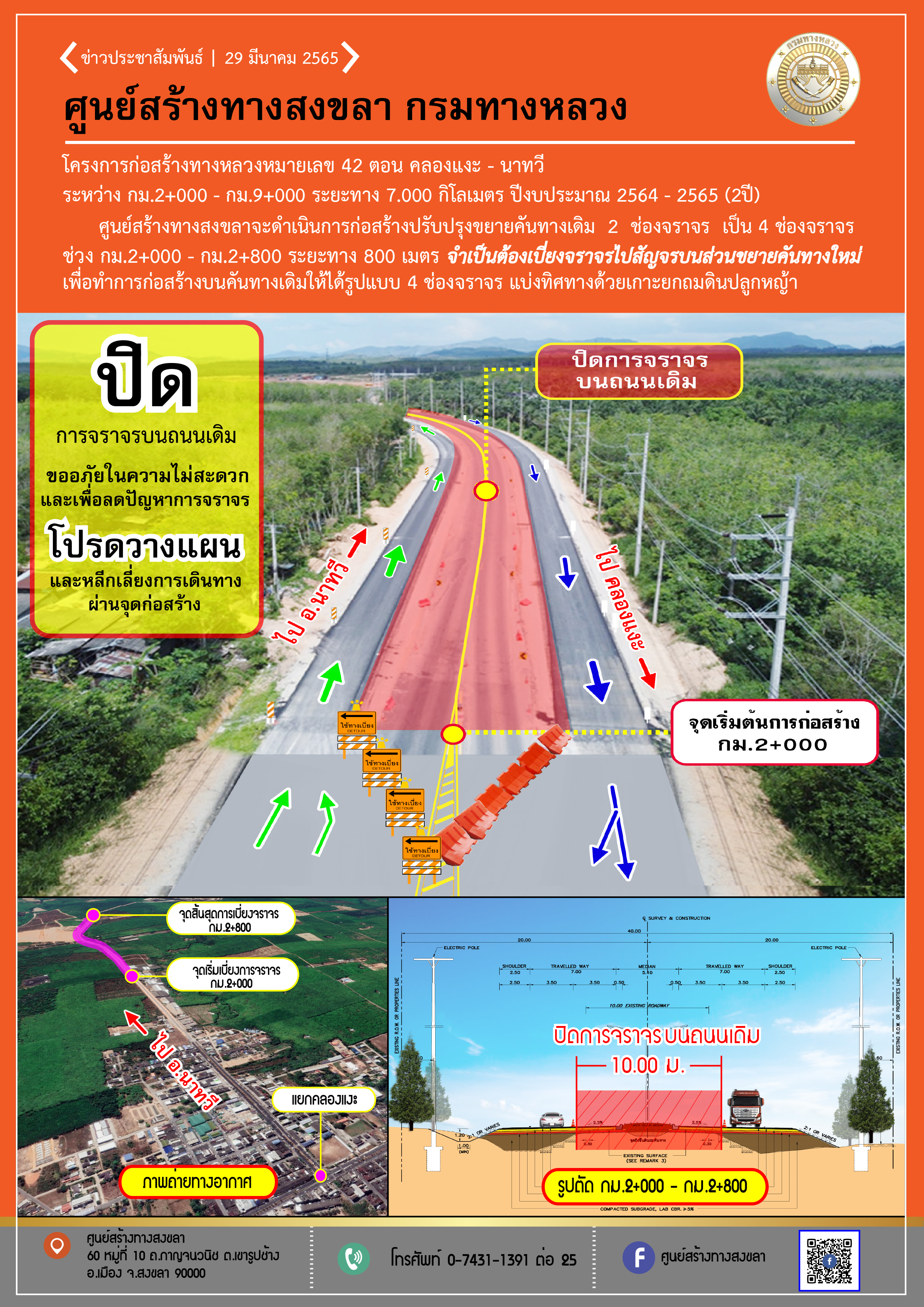 ประชาสัมพันธ์ ขอปิดการจราจรบนถนนเดิม ทางหลวงหมายเลข 42 ตอน คลองแงะ - นาทวี เพื่อการก่อสร้าง