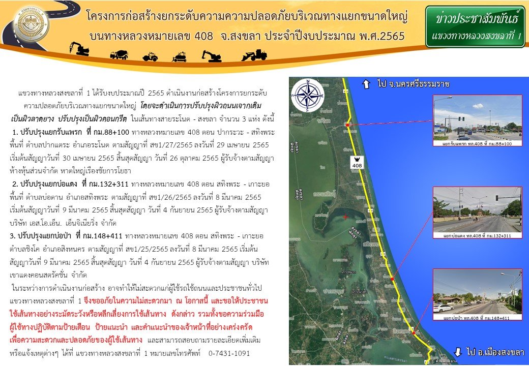 ประชาสัมพันธ์ให้ผู้ใช้เส้นทางโปรดใช้ความระมัดระวังในการเดินทางสาย ระโนด - สงขลา ระหว่างที่ดำเนินการก่อสร้างโครงการยกระดับความปลอดภัยบริเวณทางแยกขนาดใหญ่ อาจทำให้ไม่ได้รับความสะดวกในการเดินทาง จึงขออภัยในความไม่สะดวก