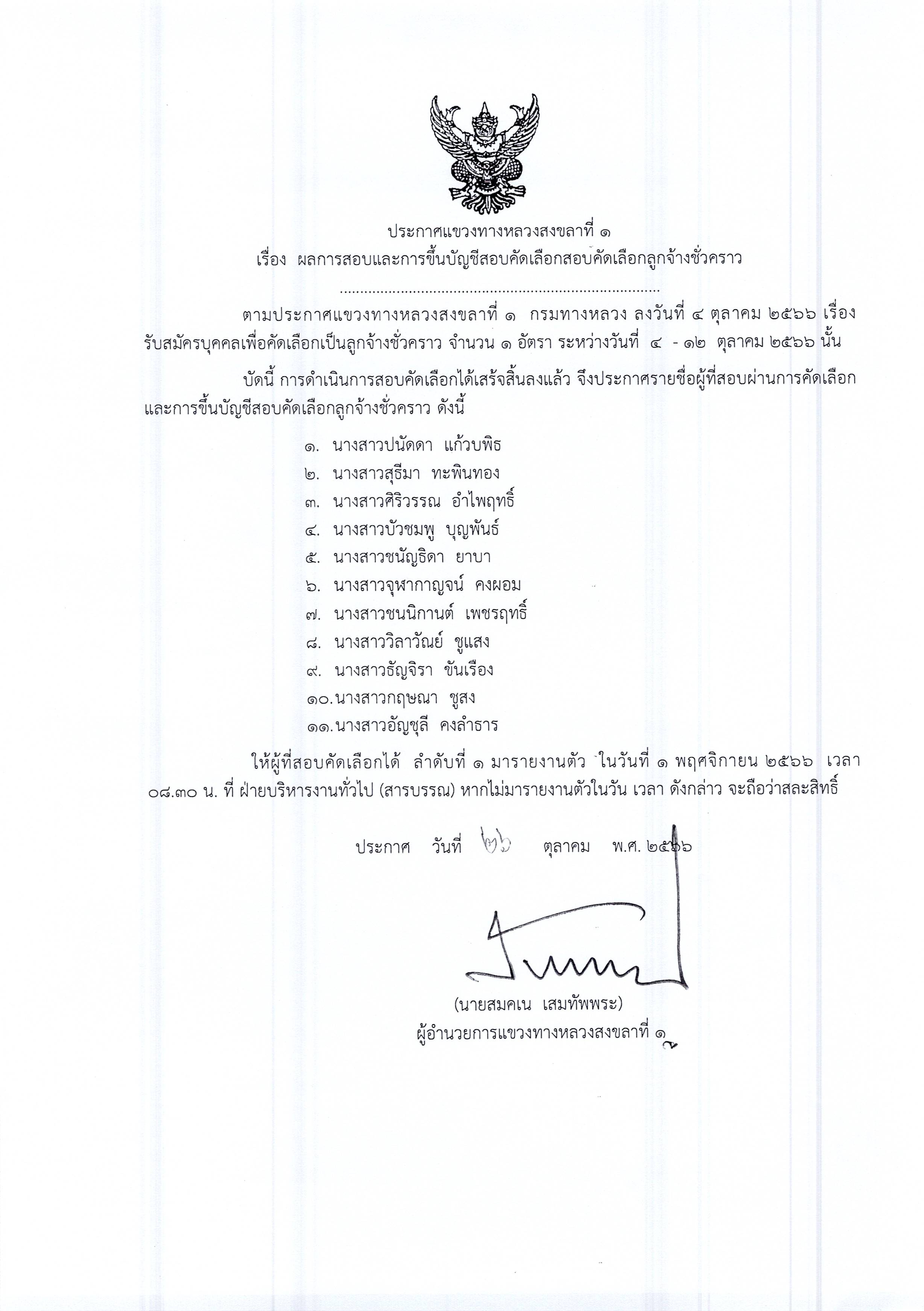ประกาศผลการสอบคัดเลือกเป็นลูกจ้างชั่วคราว