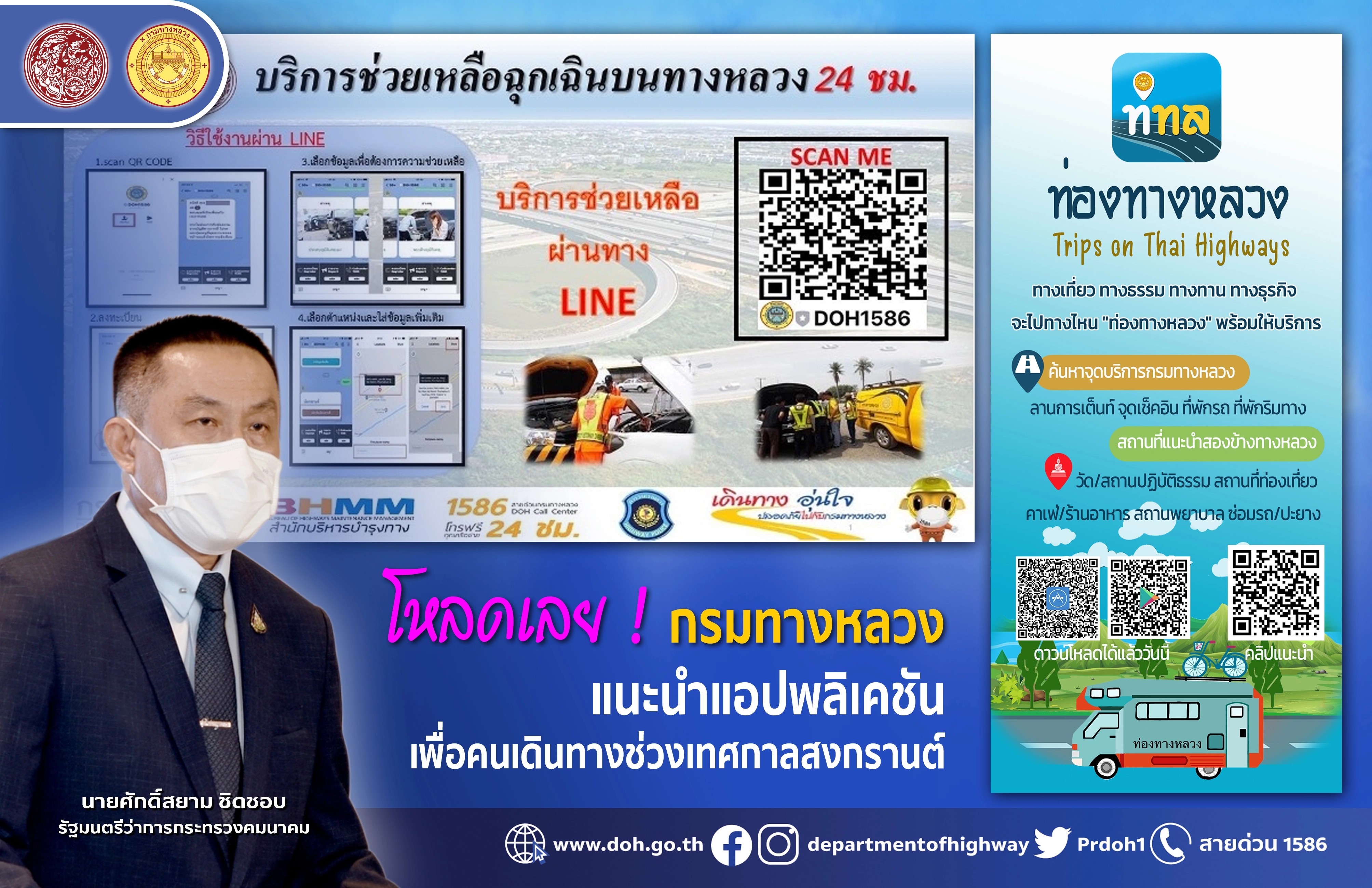 กรมทางหลวง เชิญชวนประชาชนดาวน์โหลดแอปพลิเคชันเพื่อการเดินทาง ครอบคลุมในเรื่องการเดินทางทั้ง สภาพการจราจร, สถานการณ์การจราจรแบบเรียลไทม์, ตำแหน่งตรวจจับกล้องจับความเร็ว, บริการฉุกเฉิน 24ชม., สถานีบริการน้ำมัน เเละการเดินทางท่องเที่ยวในช่วงเทศกาลสงกรานต์นี้ ตามนโยบายของนายศักดิ์สยาม  ชิดชอบ รัฐมนตรีว่าการกระทรวงคมนาคม ที่ต้องการให้นำเทคโนโลยีมาใช้แบบเรียลไทม์ นำเสนอข้อมูลผ่านแอปพลิเคชั่นเพื่อให้ประชาชนใช้ตัดสินใจในการเลือกเส้นทาง ไม่เฉพาะช่วงเทศกาลเท่านั้น