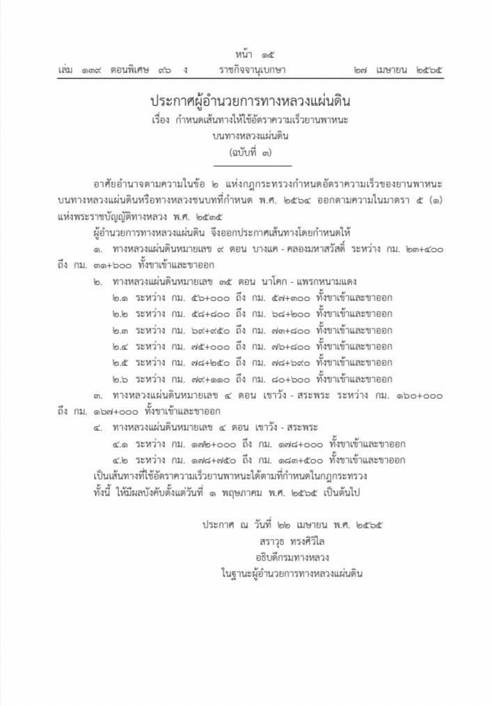 ปัจจุบันกรมทางหลวงได้กำหนดเพิ่มเส้นทางให้ใช้อัตราความเร็วไม่เกิน 120 กม./ชม. และไม่ต่ำกว่า 100 กม./ชม. ในช่องทางขวาสุด ในระยะที่ 3 ตามประกาศผู้อำนวยการทางหลวงแผ่นดิน โดยจะมีผลบังคับใช้ ตั้งแต่วันที่ 1 พฤษภาคม 2565 เป็นต้นไป จำนวน 3 สายทาง ทั้งขาเข้าและขาออก ประกอบด้วย ทล.4 จำนวน 2 ช่วง ได้แก่ เขาวัง - สระพระ ระหว่างกม.160+000 - กม.167+000 และ ระหว่างกม.172+000 - กม.183+500 จ.เพชรบุรี (เป็นช่วงๆ) ทล.9 บางแค - คลองมหาสวัสดิ์ ระหว่างกม.23+400 - กม.31+600 กรุงเทพมหานคร และทล.35 นาโคก - แพรกหนามแดง กม.56+000 - กม.80+600 จ.สมุทรสงคราม (เป็นช่วงๆ) ซึ่งกรมทางหลวง โดยแขวงทางหลวงในพื้นที่ได้ดำเนินการเตรียมความพร้อมในการรองรับการใช้อัตราความเร็วใหม่ในช่วงสายทางดังกล่าว โดยคำนึงในเรื่องความปลอดภัยกับประชาชนผู้ใช้ทางสูงสุด