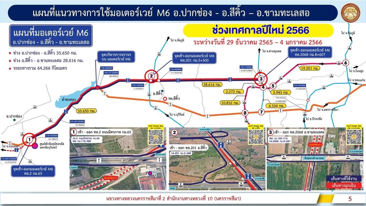 อธิบดีกรมทางหลวง กล่าวต่อไปว่า กรมทางหลวงได้ยกเว้นค่าธรรมเนียมผ่านทางบนทางหลวงพิเศษหมายเลข 7 กรุงเทพ – ชลบุรี – พัทยา – มาบตาพุด ทางหลวงพิเศษหมายเลข 9 บางปะอิน – บางพลี และทางหลวงพิเศษหมายเลข 9 พระประแดง – ต่างระดับบางขุนเทียน ตั้งแต่เวลา 00.01 น. ของวันที่ 29 ธันวาคม 2565 ถึง เวลา 24.00 น. ของวันที่ 4 มกราคม 2566 รวมระยะเวลา 7 วัน นอกจากนี้ จะเปิดให้บริการวิ่งฟรีชั่วคราวบนทางหลวงพิเศษหมายเลข 6 ช่วง อ.ปากช่อง – อ.สีคิ้ว – อ.ขามทะเลสอ ระยะทาง 64.26 กิโลเมตร ตั้งแต่วันที่ 29 ธ.ค. 65 – 4 ม.ค. 66 (โดยจัดการจราจรแบบเดินรถทางเดียว วันที่ 29 – 31 ธ.ค. 65 เดินทางขาออก และวันที่ 1 – 4 ม.ค. 66 เดินทางขาเข้า) เพื่อเพิ่มประสิทธิภาพในการเดินทางสู่ภาคตะวันออกเฉียงเหนือ ซึ่งคาดว่าจะมีปริมาณจราจรบนทางหลวงสายหลักและมอเตอร์เวย์ทั้งสิ้น 7,325,097 คัน แบ่งเป็นฝั่งขาออก 3,584,353 คัน และฝั่งขาเข้า 3,740,744 คัน โดยผู้ใช้ทางสามารถติดตามการรายงานสภาพจริงการจราจร Online แบบ Real time ผ่านแอพพลิเคชั่น M-Traffic (มอเตอร์เวย์) / Thailand Highway Traffic และเฟสบุ๊ค “ศูนย์บริหารจัดการจราจรและอุบัติเหตุกรมทางหลวง”