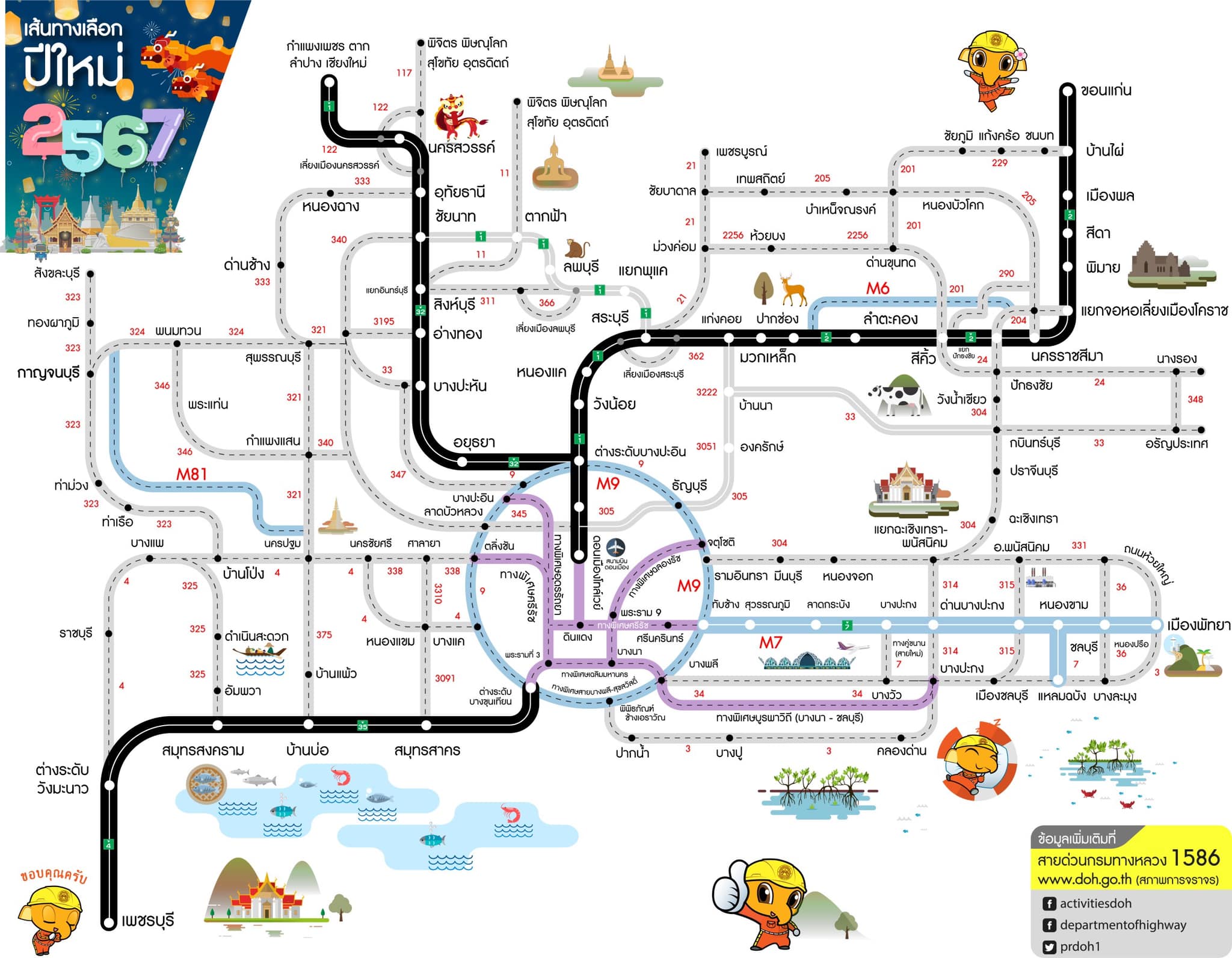 ทั้งนี้กรมทางหลวงขอความร่วมมือผู้ใช้ทางขับขี่ด้วยความระมัดระวัง ปฏิบัติตามป้ายเตือน ป้ายแนะนำ และคำแนะนำของเจ้าหน้าที่อย่างเคร่งครัด หากประชาชนต้องการสอบถามข้อมูลการเดินทางเพิ่มเติมหรือแจ้งเหตุด่วนเหตุร้ายระหว่างเดินทาง สามารถติดต่อได้ที่สายด่วนกรมทางหลวง 1586 (โทรฟรีทุกเครือข่ายตลอด 24 ชั่วโมง) สายด่วนมอเตอร์เวย์ 1586 กด 7 และตำรวจทางหลวง 1193