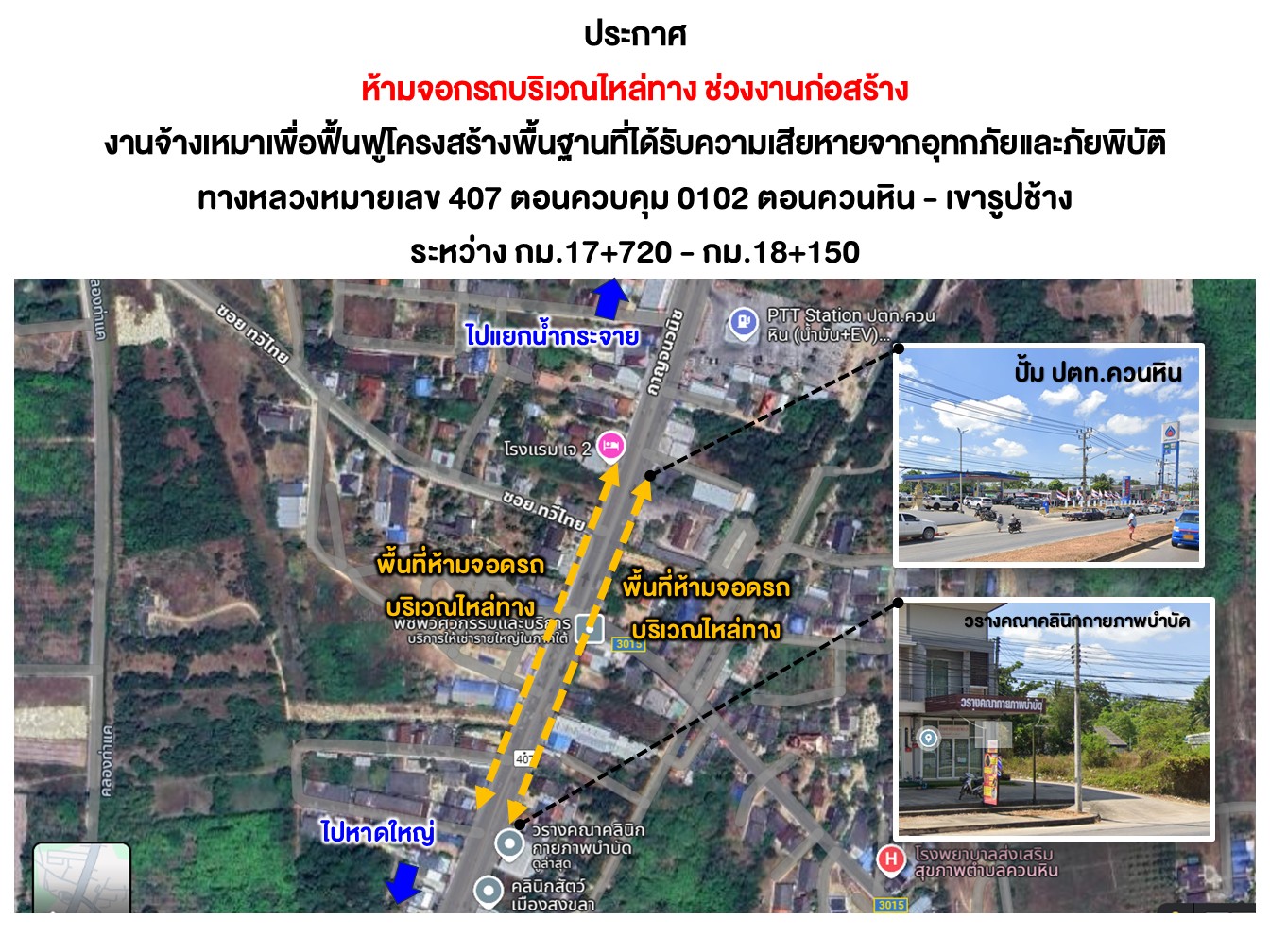 ทางหลวงหมายเลข 407 ตอนควบคุม 0102 ตอนควนหิน - เขารูปช้าง ระหว่าง กม.17+720 - กม.18+150 ตั้งแต่เดือนกุมภาพันธ์ 2568 จึงขอความร่วมมือ ห้ามจอกรถบริเวณไหล่ทาง ช่วงงานก่อสร้าง