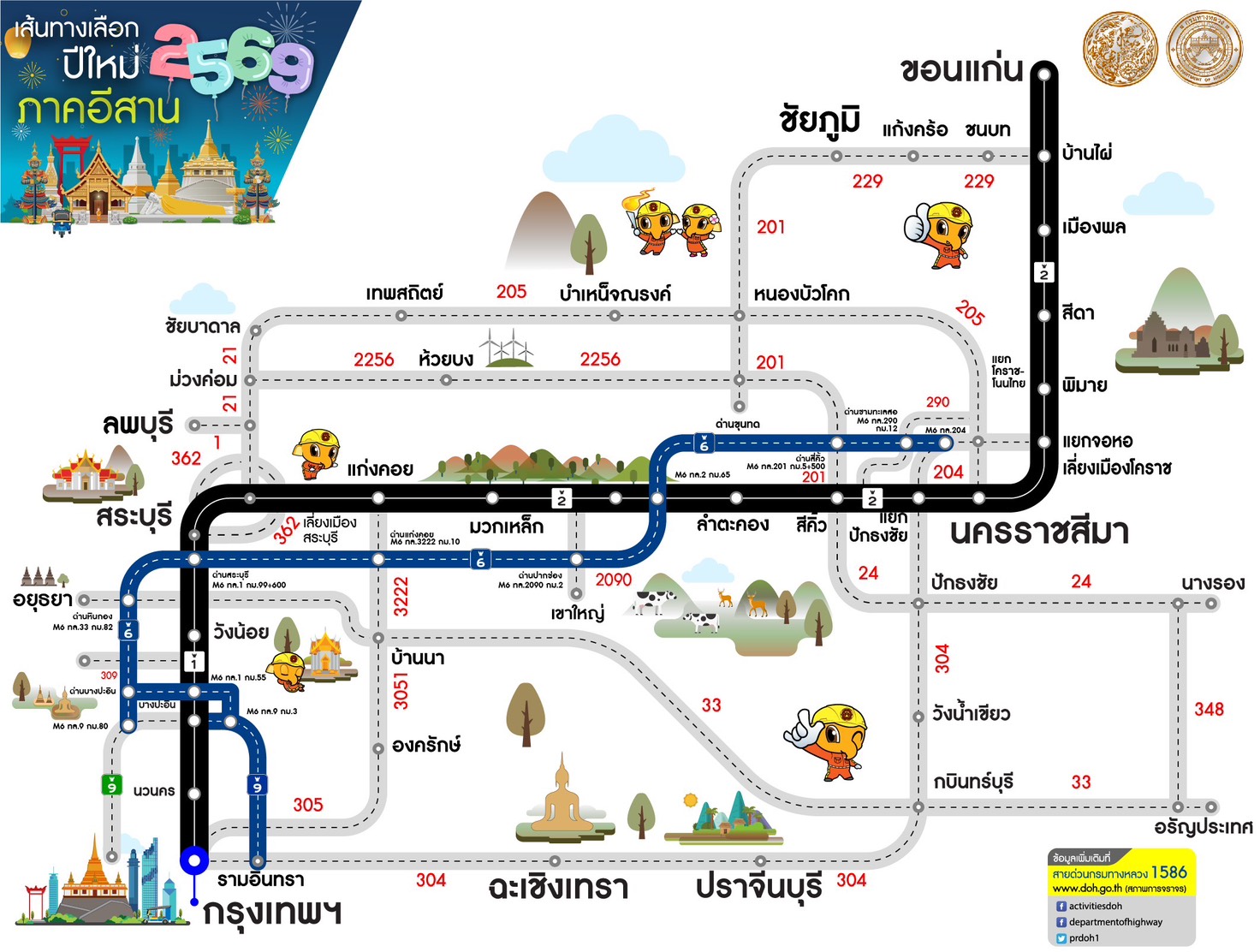 กรมทางหลวง โดยสำนักอำนวยความปลอดภัย ได้แนะนำเส้นทางเลือกให้กับประชาชนในช่วงเทศกาลปีใหม่ระหว่างวันที่ 26 ธันวาคม 2568 – 5 มกราคม 2569 เพื่อเป็นการอำนวยความสะดวกแก่ ผู้เดินทางและหลีกเลี่ยงปัญหาการจราจรติดขัด รวมถึงช่วยให้ประชาชนวางแผนการเดินทางล่วงหน้าได้เป็นอย่างดีบนทางหลวงสายหลักและสายรอง ดังนี้